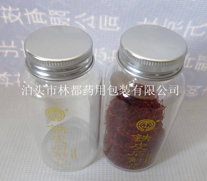 如图所示, 瓶中所盛装的产品为藏红花, 藏红花是属名贵的中药材, 藏红花的颜色鲜艳,而漂亮,使用通透性较好的玻璃瓶,更展示了藏红花的魅力。